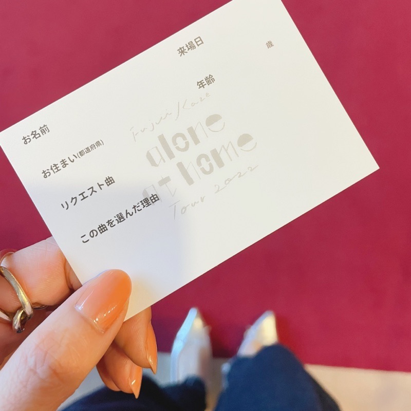いやそうだよね、そういうことだよね。やっちまったな~。私実は、渾身の1曲と言われて、考えに考えて結局「優しさ」って書いちゃったんです。そう、さっきやりましたね?たぶんセットリストに入ってるだろうなと思った!思ったにもかかわらず書くというね。あ~失敗したわ~。いや何回歌ってくれてもいいんだけどね。せっかくだから違う曲聴きたいよね!というわけで、私は全力で引かれないことを祈っておりました笑。あとで全部読むからと言っていた風くん、彼のことだから本当に全部読むのでしょう。無事引かれなかったので、あとは思いの丈を込めた理由の3行に少しでも喜んでもらえたらと思います。はい。