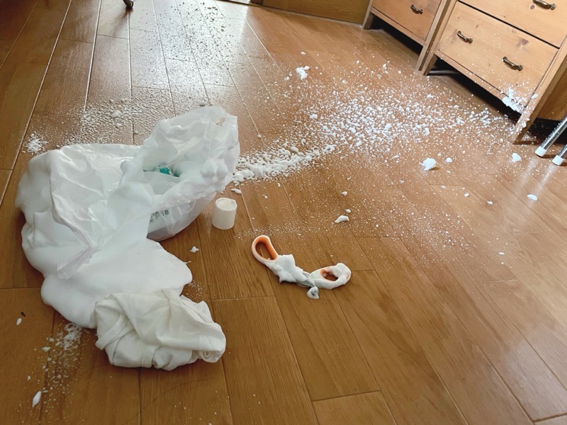 いやわたしゃてっきり液体が出てくると思ってボロ布に染み込ませようとしていたからびっくりしちゃった。そうか、ムースの缶はこうなるのね笑。