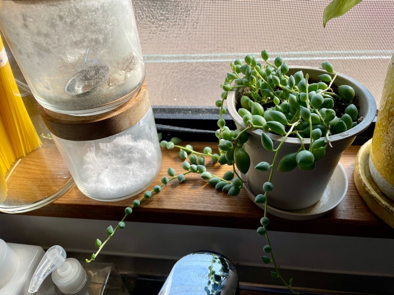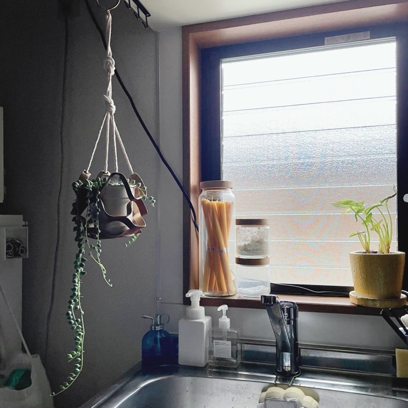 キッチンでは念願のグリーンネックレスのハンギングをついに実現!