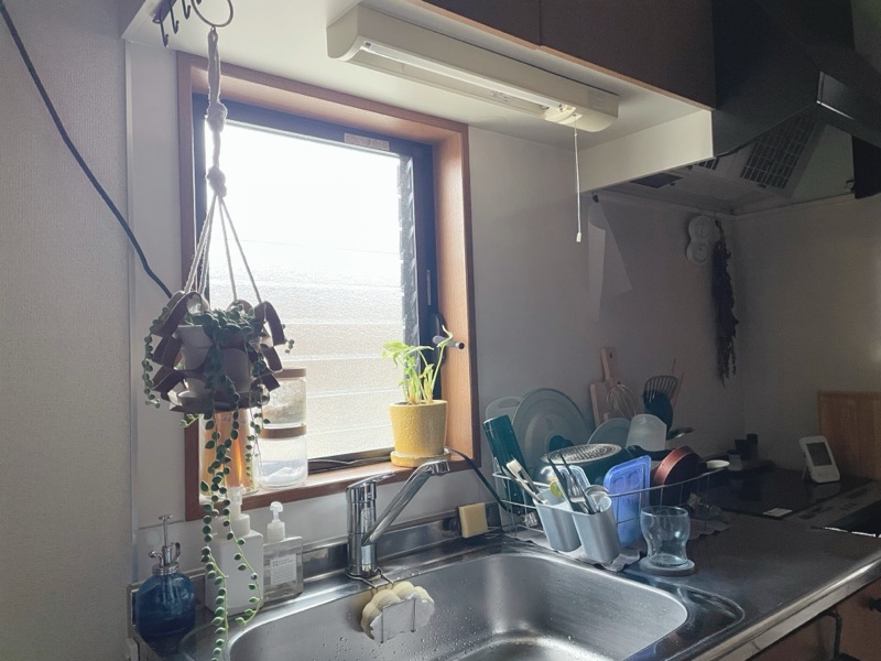 こんな雰囲気のキッチン。洗った食器の生活感...笑。