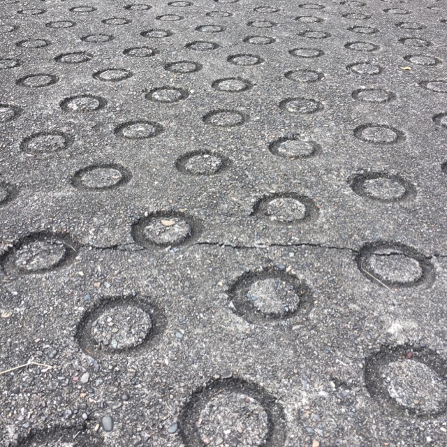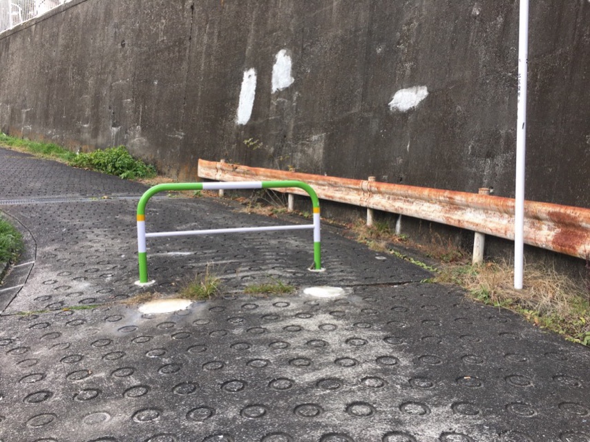 坂道を降りていくと、引っこ抜かれて埋められて、別の車止めが刺さってるけど、先生が乗っていた黄色い車止めがあったところがあった。