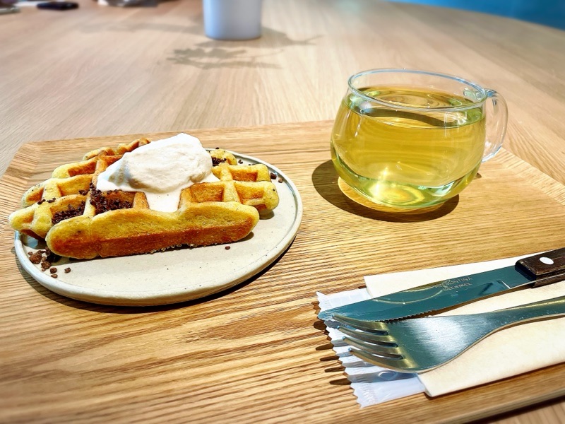 ミントグリーンティーとシナモンクリームのワッフルプレート。