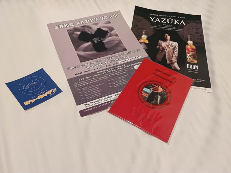 DAY1のお土産。ヨシーキッチンのステッカーは青!青か黄と思ってたからやったね♬あとお土産(窓からお手々っ)とヤズーカの第二弾&シングルのアナログ盤BOXのフライヤー。うぅっ、ごめんもう財力の限界です。BOXのデザイン、吉井さんの毛布のような優しさと、Yの字がいくつもの分岐点を通ってきた20年のように思えて、とにかくすっごく気に入ってしまった。手元に置けないのが本当に残念...という言葉を頭の中で考えていたのに...