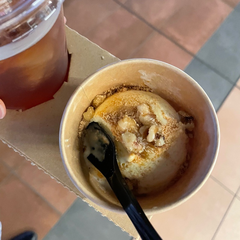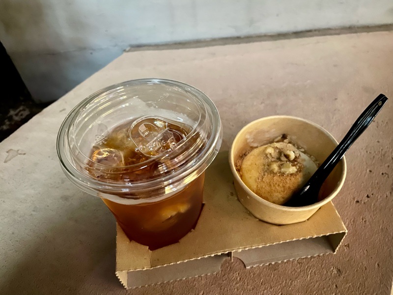 レッドルイボスティーと黒糖きなこアイス(吉井和哉が割った“くるみ”入り)1200円。