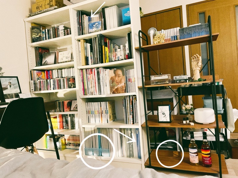 シェルフのヤズーカ(ウイスキー)の隣の○に何を置こうか考え中で、ただ青が好きなだけで収納グッズ買ってた頃の名残が矢印と白い棚の○のところ。ずーーーっと気になりつつしぬわけじゃないから放置してきたけど、今年こそ!今年こそ買い替えたい!ほんとは雑誌の切り抜きのファイルも一つだけ水色なの気になるけど、入れ替えるのちょう億劫...。でも他の買い替えたら絶対気になるだろうな笑。やるか〜〜。