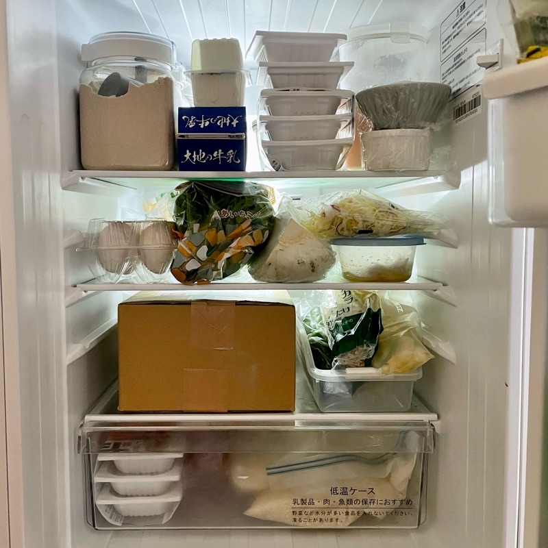 一人暮らしの冷蔵庫(150L)には段ボールごと入れるとだいぶ場所をとっていた笑。もう一回り大きい冷蔵庫買えばよかったとずっと思ってる。