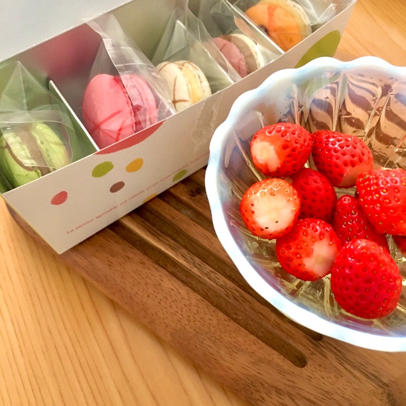 差し入れのマカロンとお友達から苺。我々可愛すぎか!(自分で)
