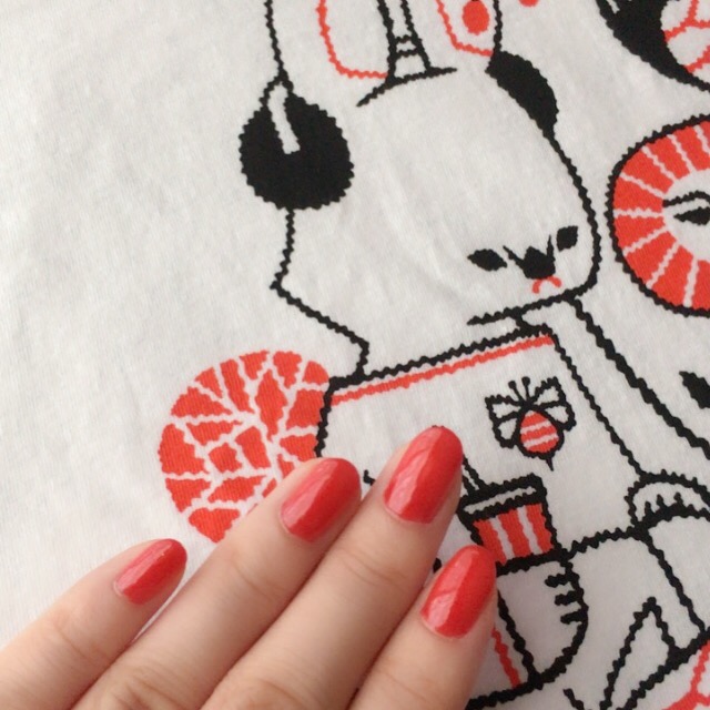 ビッグTシャツの色味に合わせて、ダイソーのエスポルールのバーミリオンで。